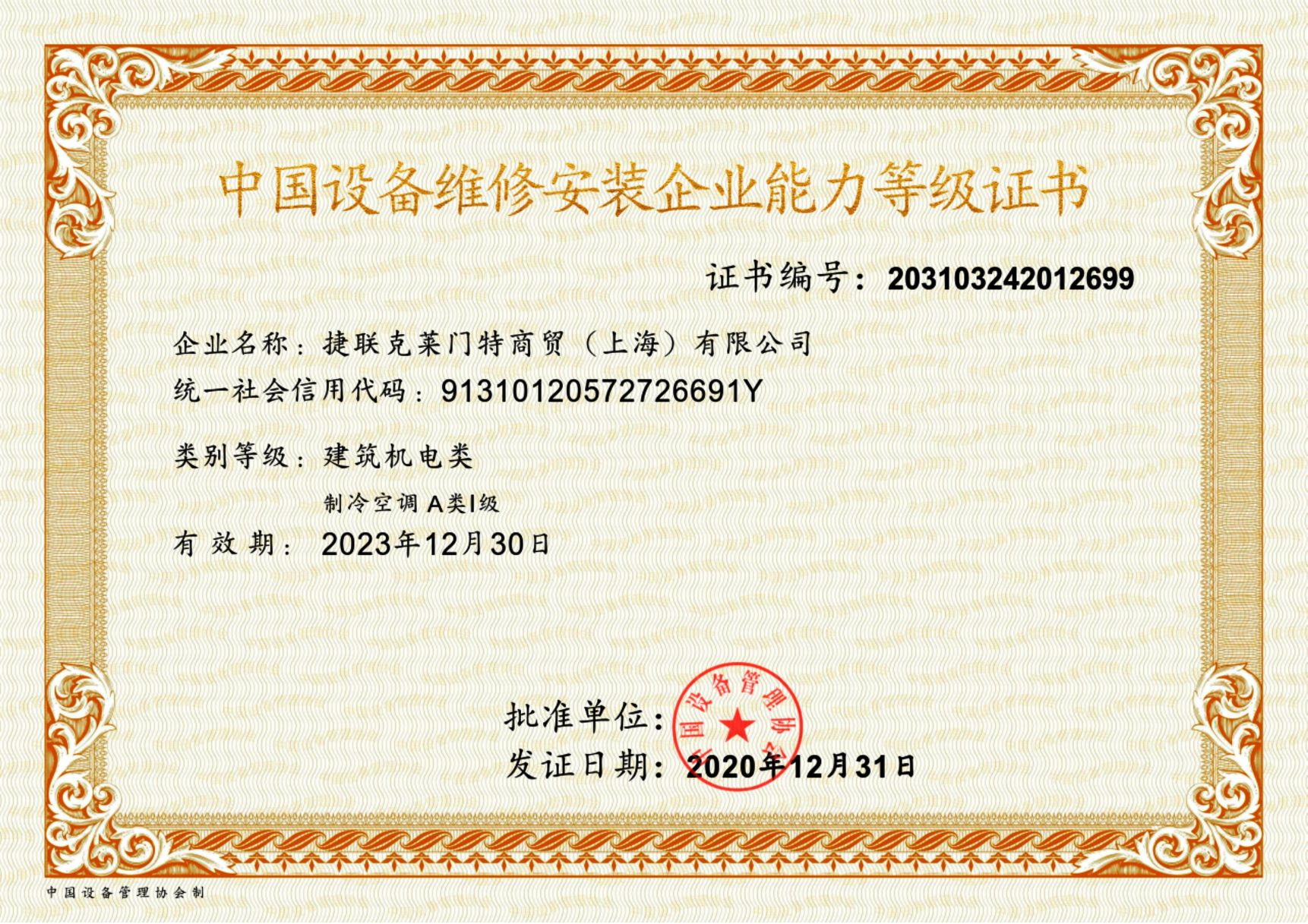 Climaveneta air conditioning after-sales service Center has been certified by The National Development and Reform Commission of China Equipment Management Association as China refrigeration and air conditioning equipment Maintenance and Installation Enterprise Capability Level A class I qualification.